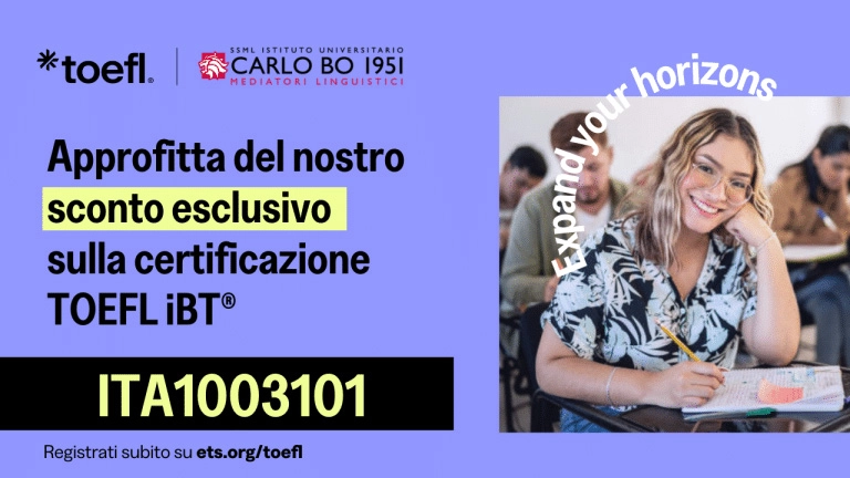 Se sei uno studente SSML Istituto di Alti Studi Carlo Bo, puoi richiedere uno sconto per sostenere il tuo test di inglese TOEFL iBT®, la certificazione di riferimento internazionale per studi universitari, lavoro e mobilità; si tratta di un requisito essenziale per coloro che desiderano studiare o lavorare in un ambiente internazionale.